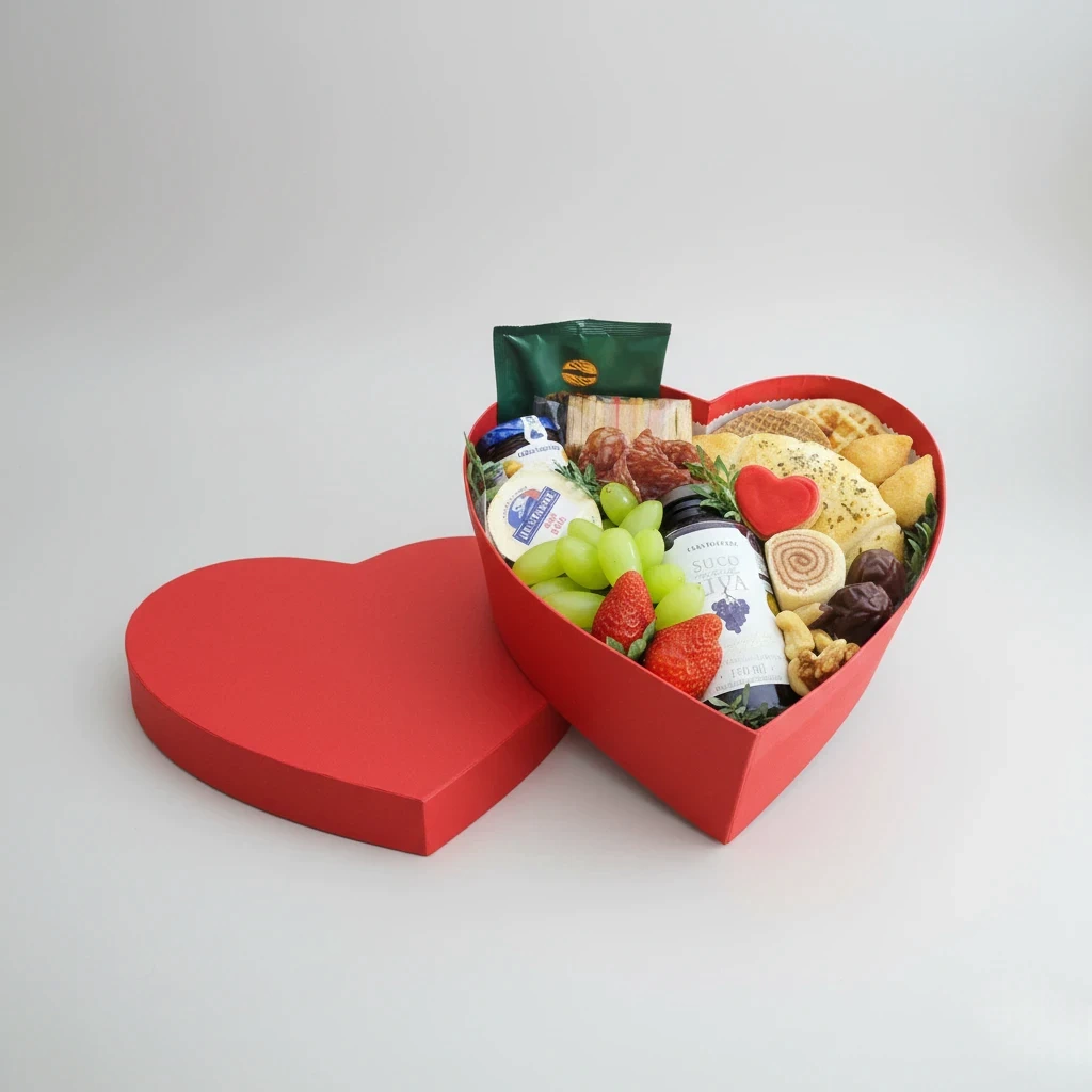 A apresentação é feita em uma caixa vermelha acartonada em formato de coração, finalizada com um lenço de tecido, que confere elegância e beleza desde o primeiro olhar.
